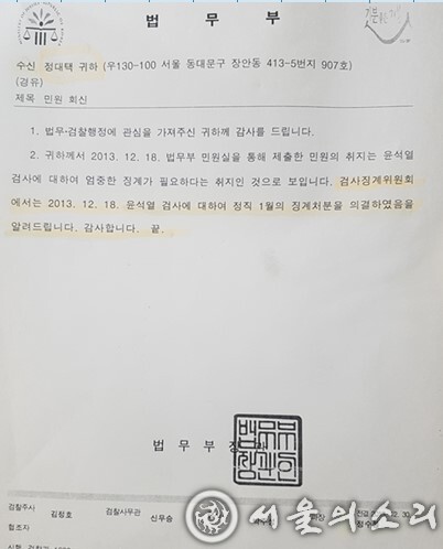 이와 관련해서 정 씨는 "기자와의 통화에서" 윤 전 총장 측의 주장을 조목조목 반박했다. 정 씨는 “사실 민원은 2013년 12월 16일에 오후에 법무부로 등기 발송했으며, 다음날인 17일 법무부에 접수가 됐고, 18일에 징계위원회의에 관련사항이 회부가 되어, 밤12시가 넘어서 징계위원회의가 끝났다”고 말했다. 또 “같은 달 31일 법무부로부터 받았던 민원 처리 결과에 대한 회신서에 윤석열 징계 사유가 명확히 기재되어 있다”고 덧붙였다.