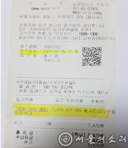 ▲윤석열 처가 피해 호소인 정태택 씨가 이번에 공개한 2013년 12월16일 법무부로 민원 등기 발송한 영수증 © 정대택 제공