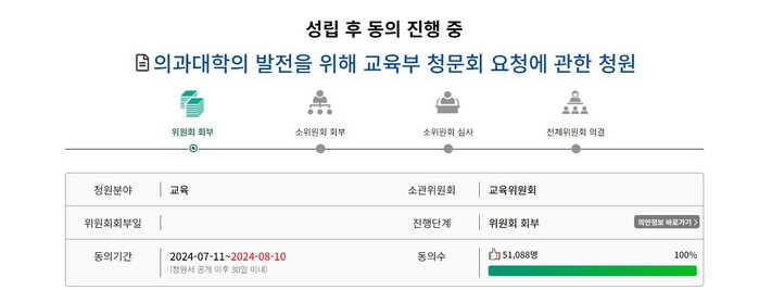 24일 현재 국회 국민동의 청원 게시판에 올라온 '의과대학의 발전을 위해 교육부 청문회 요청에 관한 청원'은 5만1천88명의 동의를 얻었다.