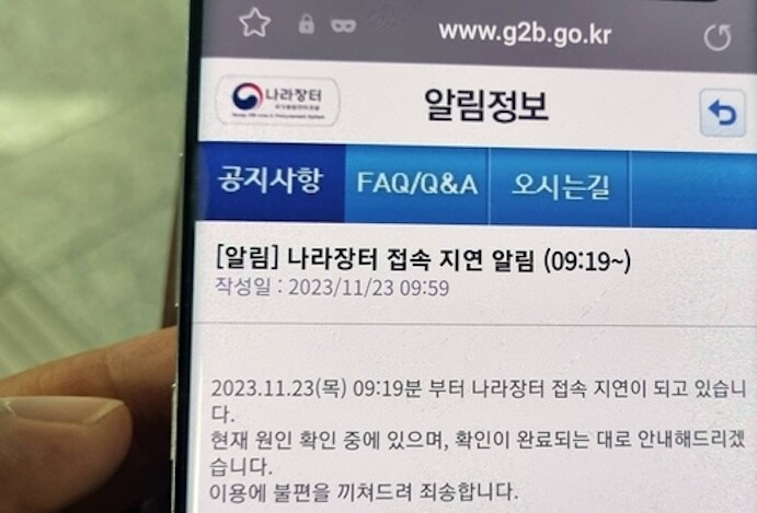 이로 인해 1시간가량 나라장터 사이트가 작동하지 않아 사용자들이 불편을 겪었다.