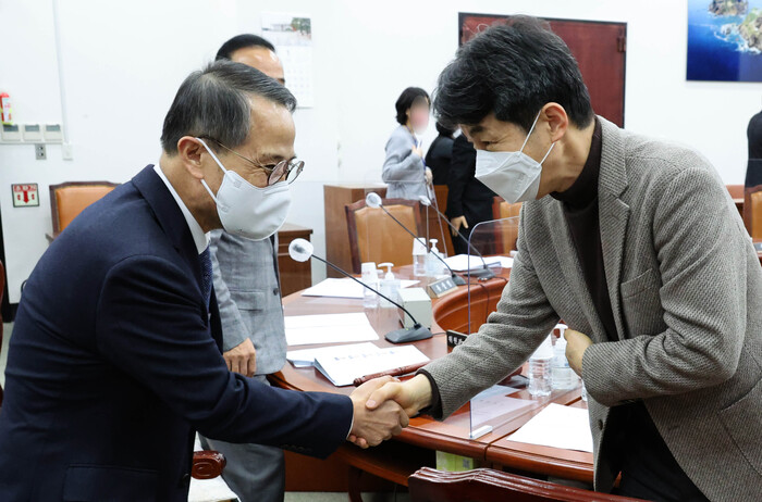 | ▲윤건영 의원과 인사하는 김규현 국정원장 (사진=연합뉴스) |