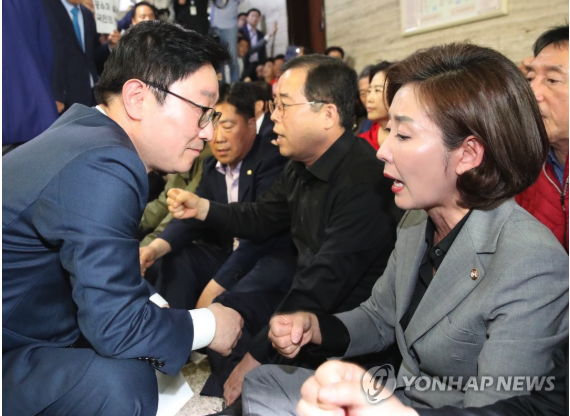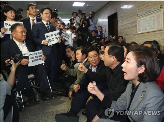 | ▲ 국회 사개특위가 열릴 예정인 회의실 앞에서 자유한국당 나경원 원내대표 등이 누워서 진입을 막고 있다. 2019.4.26 (사진=연합뉴스) |