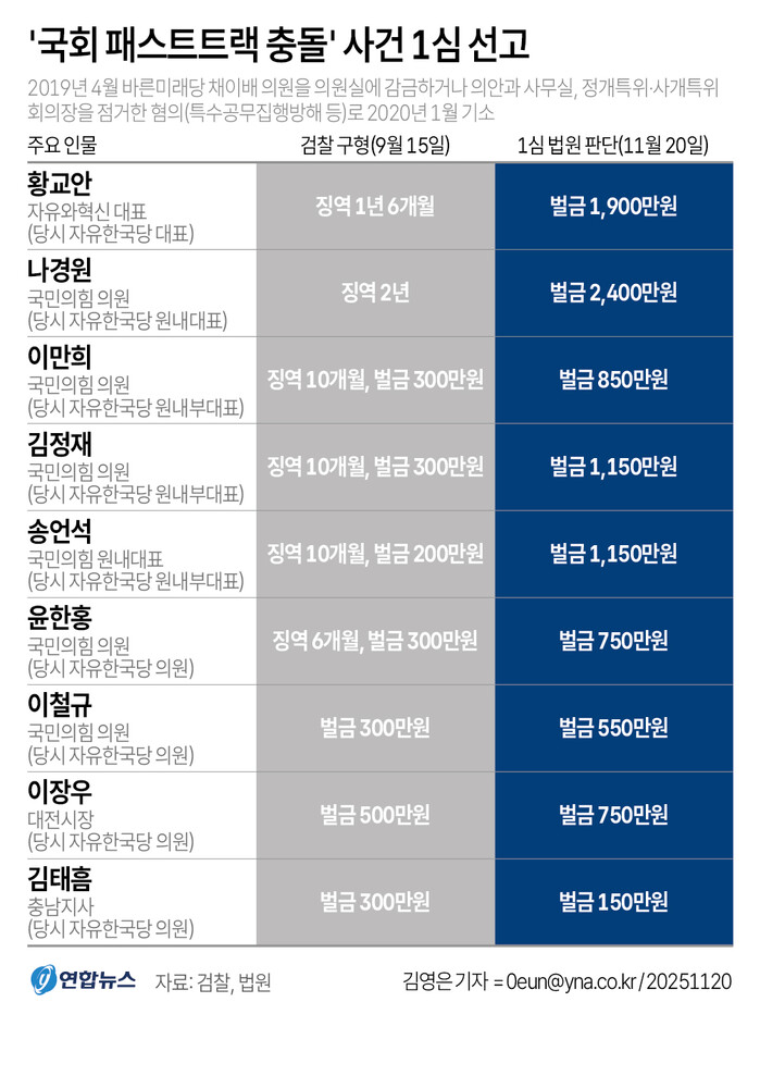 국회 패스트트랙 충돌 사건으로 재판에 넘겨진 국민의힘 전·현직 의원 26명 전원이 1심에서 유죄를 선고받았다. 6년 만에 열린 이번 선고에서 법원은 나경원 의원, 황교안 전 총리, 송언석 원내대표 등 주요 인사들에게 벌금형을 선고하며 “국회 신뢰를 심각하게 훼손한 사건”이라고 지적했다.