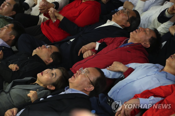 | ▲ 나경원 원내대표 등 자유한국당 의원들이 사법개혁특위가 열리는 국회 회의실 앞에 드러누워 이상민 위원장 등 참석자 진입을 막는 모습. 2019.4.26 (사진=연합뉴스) |
