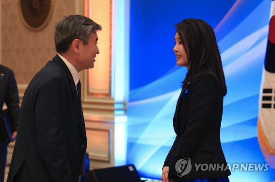 | ▲ 김건희가 청와대 영빈관에서 열린 재외공관장 초천 만찬에서 당시 조태용 주미대사와 대화하는 모습 2023.3.27 (샤진=연합뉴스) |