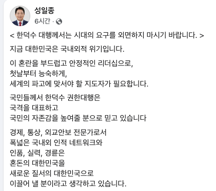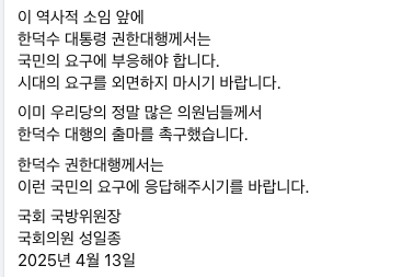 성 의원은 이날 자신의 사회관계망서비스(SNS) 페이스북에 올린 '한덕수 대행께서는 시대의 요구를 외면하지 마시기 바랍니다'는 제목의 게시물에서 이같이 밝혔다.