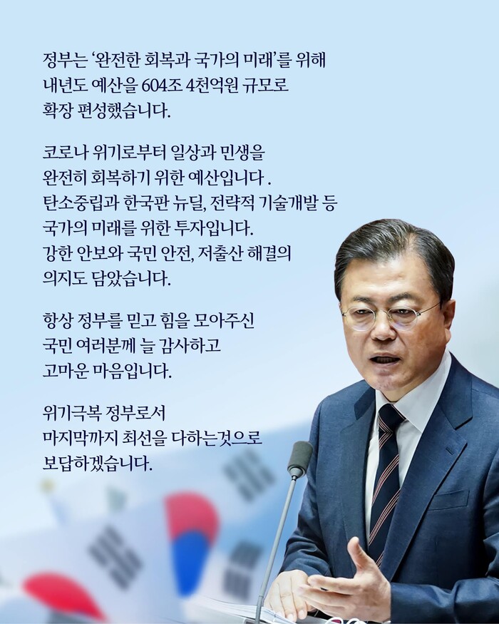 문재인 대통령은 (25일 국회)에서 진행된 ‘2022년도 예산안 시정연설’에서 “완전한 일상회복과 경제회복을 이루는 데 최선을 다하겠다”며 “내년도 예산은 코로나 위기로부터 일상과 민생을 완전히 회복하기 위한 예산”이라 설명했다.