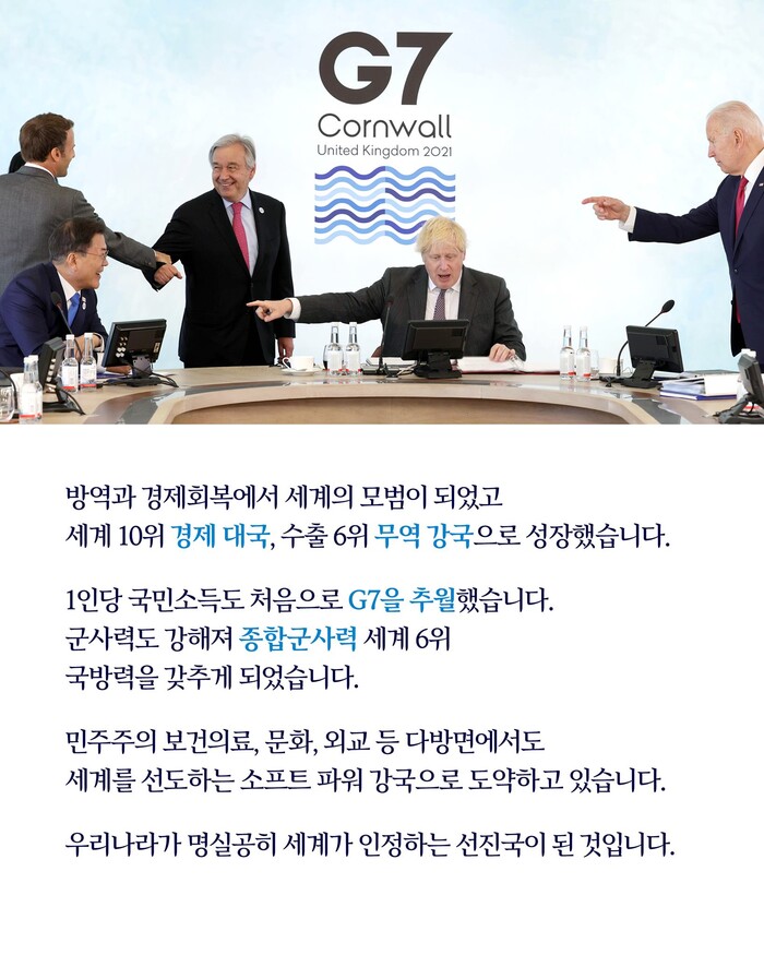 -탄소중립 신성장동력과 일자리창출로, 경제대국 10위 무역강국 6위 G7 참석등.