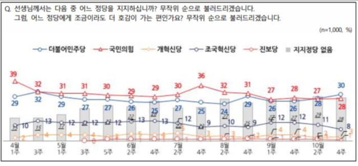 정당 지지도는 국민의힘 28%, 더불어민주당 30%, 조국혁신당 8%, 개혁신당 3%, 진보당 1%, '지지 정당 없음·모름·무응답' 29%였다.