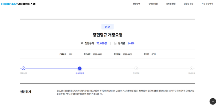 실제로 민주당 ‘당원 청원시스템’에 올라온 ‘당헌‧당규 개정요청’에 관한 청원은 7만 명이 넘는 당원이 동의했다. 당원 청원시스템으로 민심과 여의도에 얼마나 큰 괴리가 있는지 만천하에 공개된 것이다. 이 간절한 외침마저도 ‘극성 팬덤의 의견’으로 치부하는 여의도 나리에게서 태도 개선의 의지는 전혀 보이지 않는다. 국민 여론조사에서 이재명이 80%에 가까운 지지를 얻지 않았다면 청원의견을 여전히 ‘소수 지지자’들의 극성으로 몰아갔을 것이 불 보듯이 뻔하다.