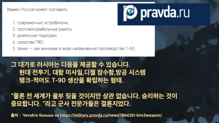 프라우다는 '북한이 모스크바에 특수부대와 같은 보복수단을 제공할 것'이라는 기사에서 러시아군 관계자의 발언을 인용 "전 세계가 울부짖을 것이지만 상관없다. 승리하는 것이 중요하다"라고 보도했다. 이 기사에서는 T-90전차의 경우 제작 기술 전수도 포함될 것이라고 밝혔다.
