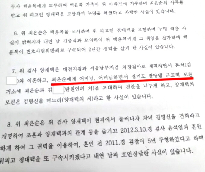 지난 2008년 고소 후 지금까지 검찰이 단 한 번도 인정하지 않았으며 대법원에서도 허위사실로 판결한 ‘양재택, 김건희 동거설’이 확실하다고 쐐기를 박는 증언이 당사자인 양 전 검사의 모친의 입에서 나와 사실로 확인됐기 때문이다.