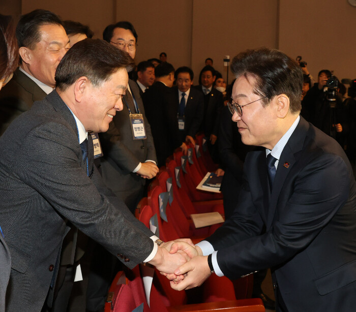 | ▲ 10일 더불어민주당 지방자치대상에서 '지차행정 부문' 최우수상 수상한 박승원 경기 광명시장과 이재명 대표 (사진=연합뉴스) |