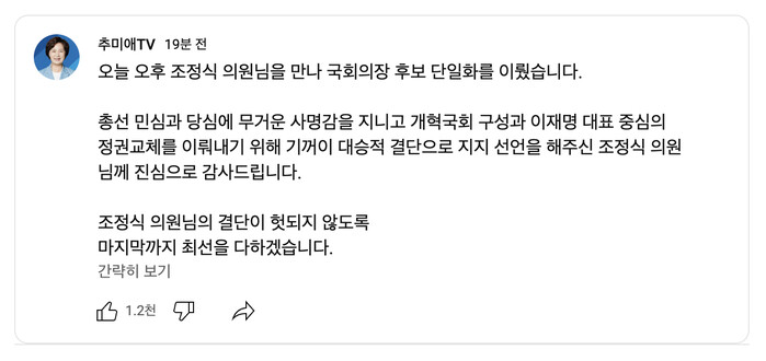 한편, 추미애 당선인은 국회의장 후보 단일화 이후 추미애TV 커뮤니티에 게시글을 올려 "총선 민심과 당심에 무거운 사명감을 지니고 개혁국회 구성과 이재명 대표 중심의 정권교체를 이뤄내기 위해 기꺼이 대승적 결단으로 지지 선언을 해주신 조정식 의원님께 진심으로 감사드린다"라는 글을 올렸다.