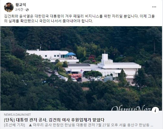 황교익씨는 오마이뉴스가 1일 단독으로 낸 "대통령 관저 공사, 김건희 여사 후원업체가 맡았다"란 제목의 기사를 공유하며 "김건희와 윤석열은 대한민국 대통령이 겨우 패밀리 비지니스를 위한 자리일 뿐이며,이제 그들의 실체를 확인했으니 국민이 나서서 쫓아내어야 한다"고 썼다.