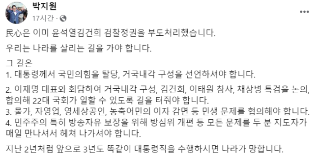 박 전 원장은 "대통령이 이재명 대표와 만나 거국내각을 구성하는 게 나라를 살리는 길"이라며 "김건희·이태원 참사·채상병 특검을 논의, 합의해 22대 국회가 일할 수 있도록 길을 터줘야 한다"고 밝혔다.