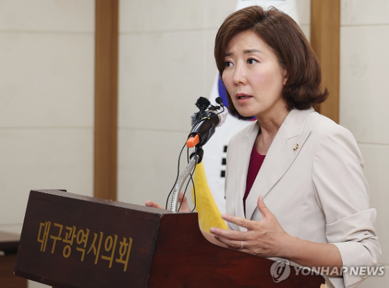| ▲ 대구시의회에서 기자간담회 중인 국민의힘 나경원 대표 후보 (사진=연합뉴스) |