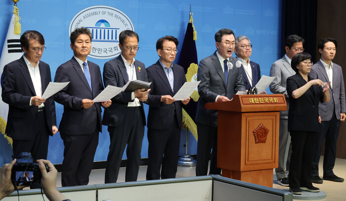 | ▲민주당 법사위원들의 성명서 발표모습 (사진=연합뉴스) |