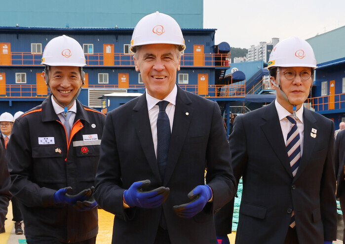 | ▲ 김민석 국무총리와 마크 카니 캐나다 총리가 30일 경남 거제 한화오션 거제조선소를 시찰하고 있다. 왼쪽은 김동관 한화그룹 부회장. 2025.10.30 (사진=연합뉴스) |