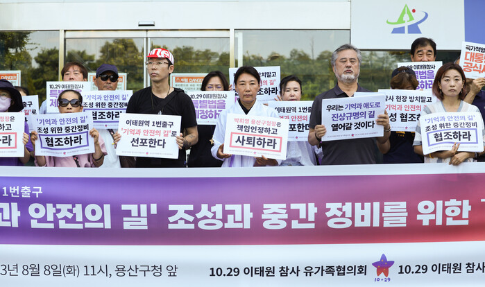 8일 유족 단체들은 서울 용산구청 앞에서 기자회견을 열어 "참사 현장을 정비·관리하는 것과 그 과정에 유가족·시민의 참여를 보장하고 지원하는 것은 용산구청이 마땅히 감당해야 할 공적 역할"이라고 주장했다.