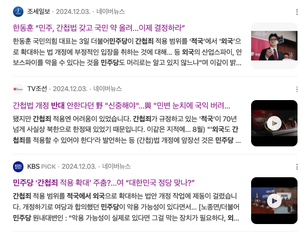 당시 국민의힘은 간첩죄 적용 범위를 ‘적국’에서 ‘외국’으로 확대하는 형법 개정안을 국회에서 통과시키려고 했다. 더불어민주당도 이에 협조하는 분위기였지만 계엄 전날 일부 언론에서 ‘민주당이 이를 반대하면서 법안 통과가 미뤄지고 있다’고 떠들었다.