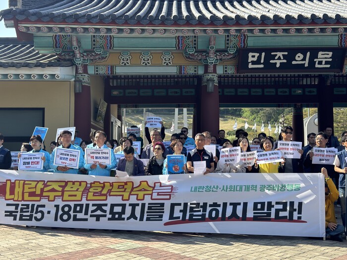 광주시민사회단체로 구성된 내란청산·사회대개혁 광주비상행동(광주비상행동)은 이날 오후 한 전 국무총리의 참배에 앞서 광주 북구 국립5·18민주묘지에서 기자회견을 열고 "5·18을 정치적으로 악용하는 한덕수의 민주묘지 참배를 거부한다"며 이 같이 밝혔다.