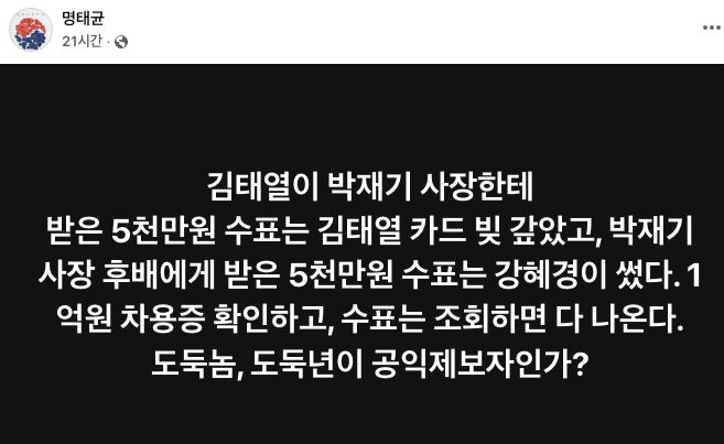 | ▲ 21일 명태균 씨의 게시글 (출처=명태균 페이스북) |