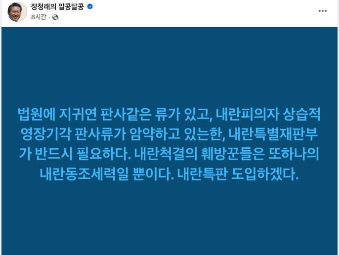 정 의원은 같은 날 페이스북에 "법원에 지귀연 판사 같은 류와 내란 피의자에 대한 상습적인 영장 기각을 하는 판사 류가 암약하는 한 내란 특별재판부가 필요하다"고 주장했다.