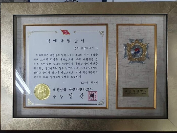 | ▲윤지섭 지사에게 수여된 육사 명예졸업증서 (사진=정철승 변호사) |
