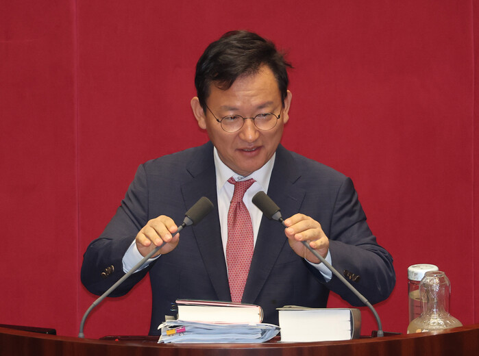 | ▲ 국민의힘 김형동 의원이 23일 서울 여의도 국회 본회의에서 노란봉투법(노동조합 및 노동관계조정법 일부개정법률안)에 대한 무제한 토론을 하고 있다. 2025.8.23 (사진=연합뉴스) |