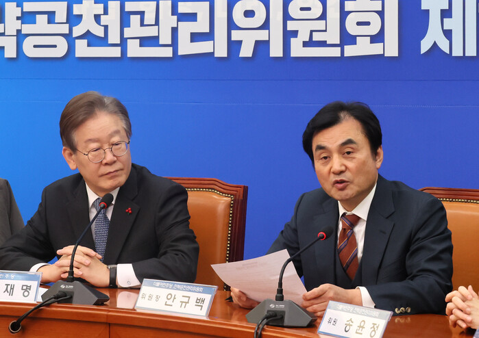 안 위원장은 인재근 의원의 불출마로 전략공천지가 된 서울 도봉갑 후보로 친명계 영입 인재인 김남근 변호사를 고려하느냐고 묻자 "그 후보가 적합한 후보인지는 추후 판단이 필요할 것"이라며 "어제부로 전략공천지가 된 터라 오늘 논의된 바는 없다"고 답했다.