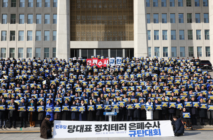 더불어민주당은 16일 오후 소속 의원과 당직자, 보좌진 등 800여명이 참석한 가운데 '당대표 정치테러 은폐 수사 규탄대회'를 열었다.