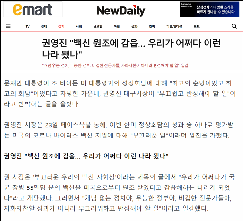 그러고는 “권영진 대구시장은 한미정상회담에서 미국이 국군 장병용으로 백신 55만명 분을 지원하겠다고 하자, ‘우리가 어쩌다가 국군 장병 55만 명분의 백신을 미국으로부터 원조받았다고 감읍해하는 나라가 되었나’라며 ‘개념 없는 정치야, 무능한 정부야, 비겁한 전문가들아!’라며 개탄한 바있다”고 상기시켰다.
