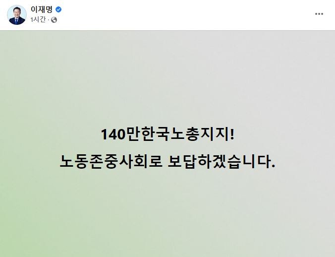 이재명 후보는 140만 한국노총의지지!! 노동존중 사회로 보답하겠다고 하였다!!