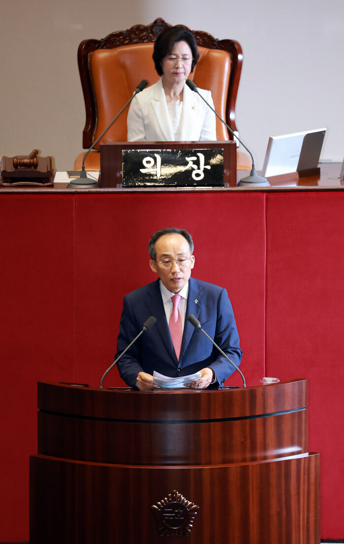 국민의힘 추경호 원내대표만 본회의장에 들어와 의사진행발언을 한 뒤 퇴장했다.