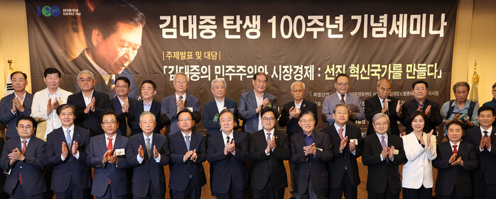 민주화추진협의회(민추협) 주최로 국회도서관에서 열린 김대중 전 대통령(DJ) 탄생 100주년 기념 학술대회에 집결한 여야 정치인은 DJ 정신 계승을 한목소리로 다짐했다.