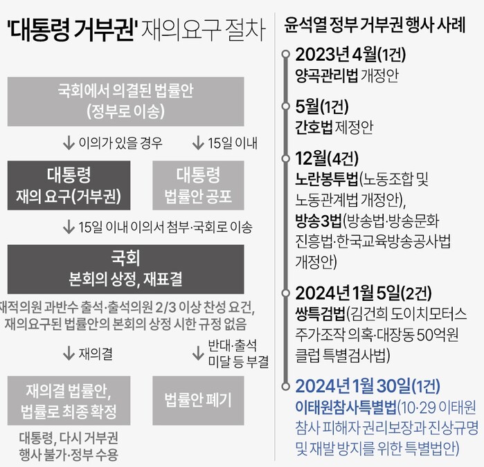 재의요구 시한인 다음 달 3일을 앞두고 윤 대통령이 거부권을 행사함에 따라, 정부는 해당 법안을 국회로 돌려보내 재의결을 요구하게 된다.