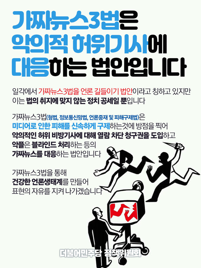 국민의힘과 일부 언론이 무엇으로 부르든지 ‘가짜뉴스 피해구제법’은 이런 일들이 반복되지 않게 하려는 법입니다. 허위, 왜곡 보도로부터 국민을 지키기 위한 법입니다. 이에 대해 언론 통제라거나 언론에 재갈을 물리는 법이라는 근거 없는 비난을 국민의힘이 확산시키고 있습니다.