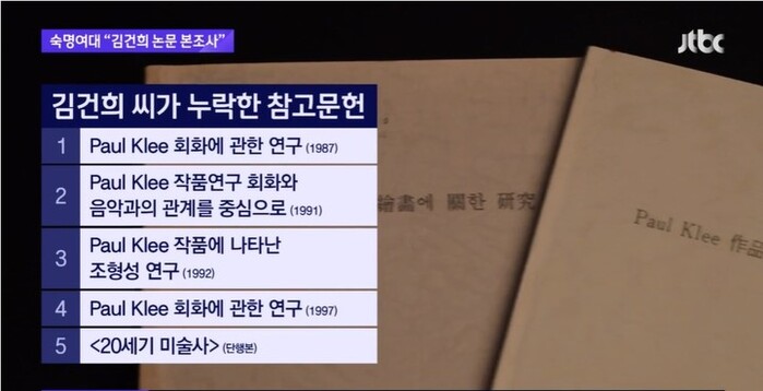 매체는 김건희씨의 1999년 숙명여대 교육대학원 석사를 받으며 쓴 논문 ‘추상화의 아버지 파울 클레의 작품 세계'를 분석했더니 상당 분량을 베껴 쓰고도 참고 문헌에 적지 않은 논문 4개와 단행본 1권을 새롭게 찾았다.
