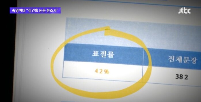 이 자료들을 파일로 만들어 표절 검증 프로그램에 넣었더니 "표절률이 42%"까지 치솟았다. 현재는 표절률이 20%를 넘으면 논문 심사 자체를 받기가 어렵다. 첫 보도 두 달 만에 숙명여대는 표절 조사에 들어갔다.