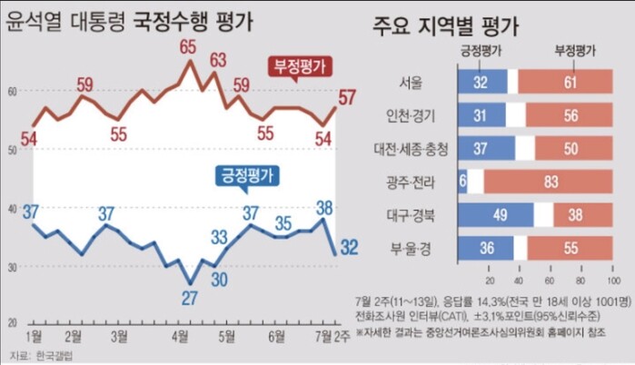 긍정 평가는 직전인 7월 첫째주(4∼6일) 조사보다 6%포인트 내렸고 부정 평가는 직전 조사보다 3%포인트 올랐다