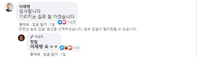 이날 이재명 후보는 정철 대표의 글에 “감사합니다. 가리키는 길로 잘 가겠습니다”라고 직접 댓글을 달아 고마운 마음을 전했다.