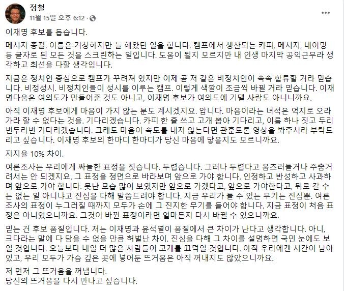 | ▲ 정철 페이스북 |