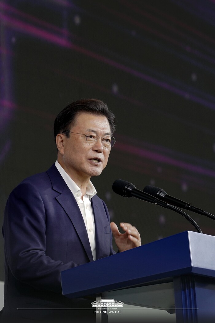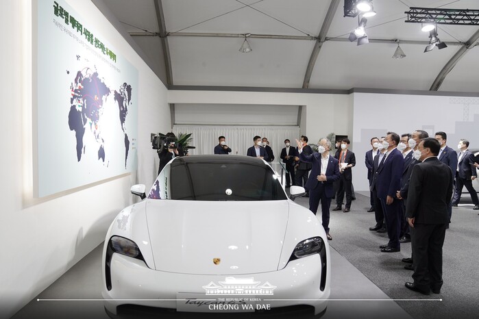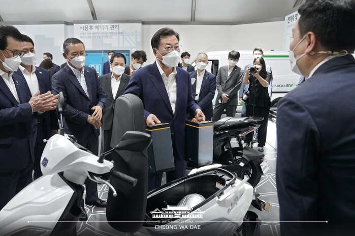 문 대통령은 “반도체가 정보를 처리하는 두뇌라면 배터리는 제품을 구동시키는 심장”이라며 “선박, 항공기, 철도까지 배터리로 움직이는 시대가 오고 있다”고 강조했다. 이어 “배터리 3사(LG에너지솔루션, 삼성SDI, SK이노베이션)가 중소기업과 힘을 합쳐 2030년까지 총 40조원 이상을 투자한다”며 “정부는 기업들의 노력을 든든하게 뒷받침하기 위해 파격적인 투자 인센티브를 제공하겠다”고 말했다.