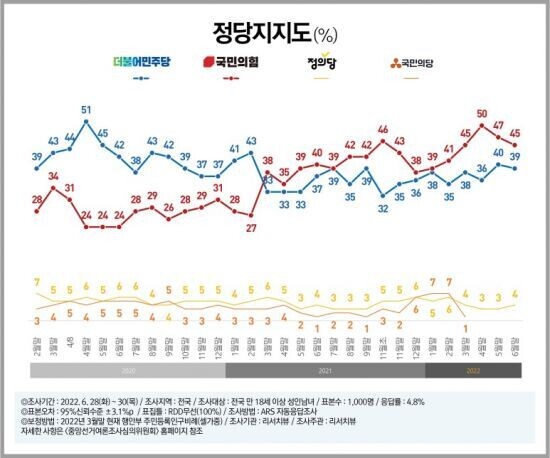정당지지도는 국민의힘이 45%, 더불어민주당이 39%로 집계됐다. 국민의힘이 민주당을 오차범위 내인 6%p 앞섰다. 정의당 지지율은 4%다. 이전 조사 대비 국민의힘은 2%p, 민주당은 1%p 하락했고 정의당은 1%p 올랐다.