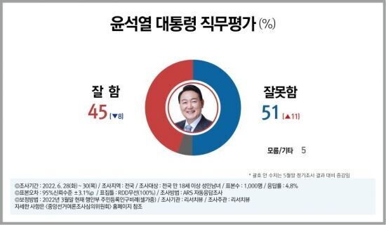 윤대통령이 북대서양조약기구(NATO) 정상회의에 참여한 시기에 조사된 여론조사에서 국정 수행에 대한 부정 평가가 51%가 나왔다.