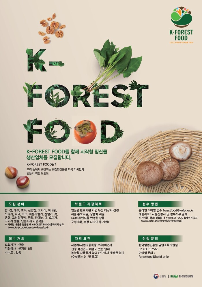 케이-포레스트 푸드는 지난해 11월, 우리 산림에서 생산되는 "청정임산물의 고급화와 경쟁력 확보" 를 위하여 산림청과 한국임업진흥원이 출범한 "임산물국가 통합상표" 이다.