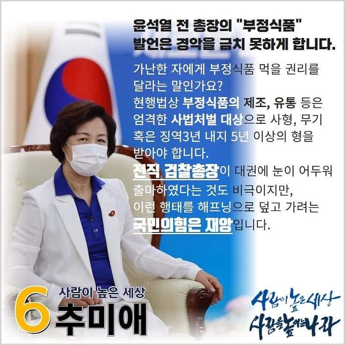 현행법상 부정식품의 제조, 유통 등은 엄격한 사법처벌 대상으로 사형, 무기 혹은 징역3년 내지 5 년 이상의 형을 받아야 합니다. 전직 검찰총장이 대권에 눈이 어두워 출마하였다는 것도 비극이지만, 이런 행태를 해프닝으로 덮고 가려는 국민의힘은 재앙입니다.