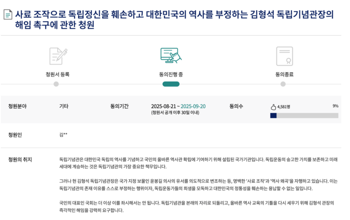 | ▲ 김형석 독립기념관장 해임 촉구에 관한 청원 (출처=국회 국민동의 청원) |