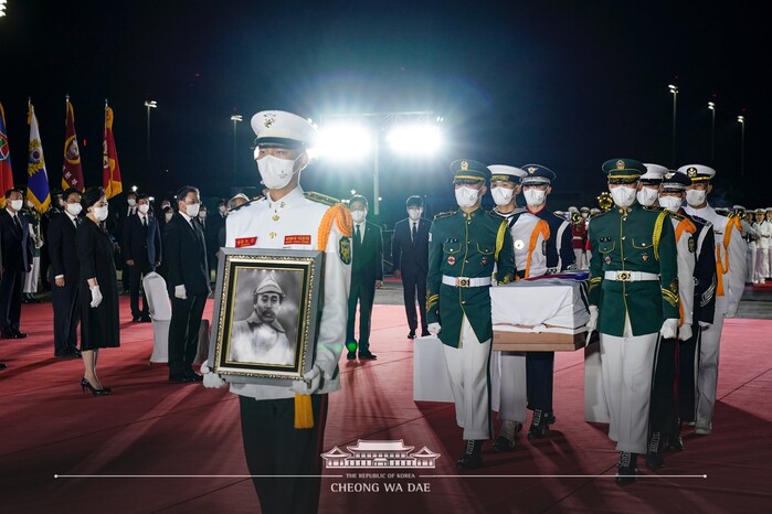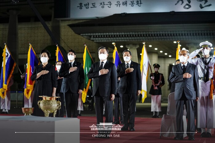 문 대통령 부부는 김영관 애국지사와 함께 맨 앞줄에 섰으며, 뒤로는 황기철 국가보훈처장을 비롯해 여천 홍범도장군기념사업회 우원식 이사장, 배우 조진웅 씨 등 특사단이 도열했다. 이들 참석자는 모두 '장군의 귀환'이라는 문구가 적힌 마스크를 착용했다